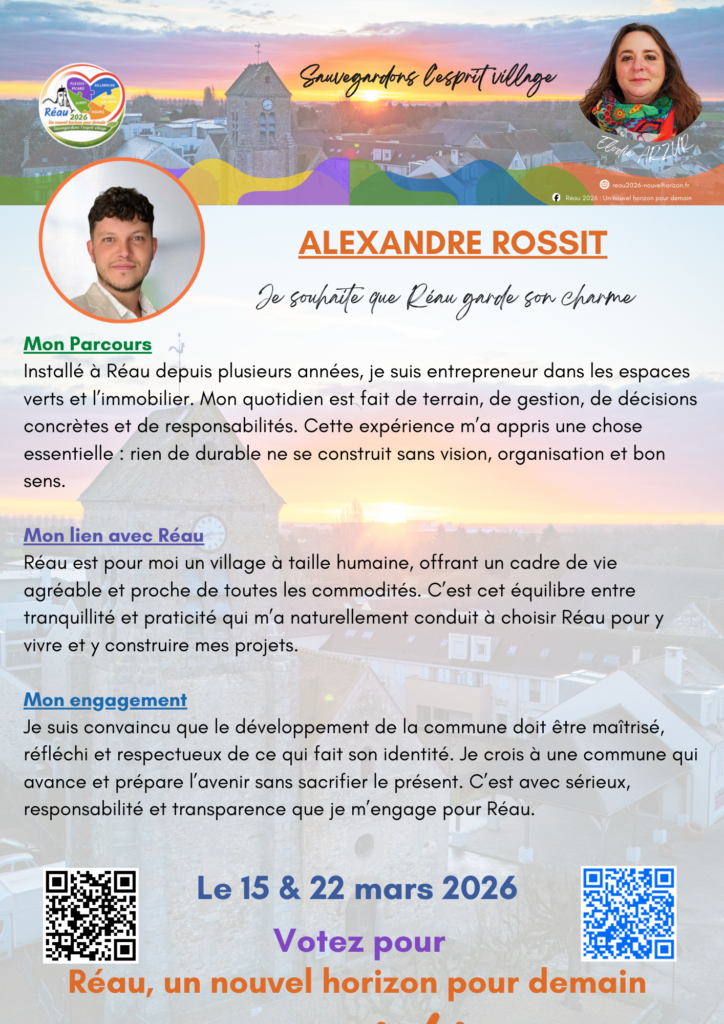 Alexandre, entrepreneur installé à Réau et habitué aux décisions concrètes du terrain, met en avant son expérience de gestion et de responsabilité acquise dans les espaces verts et l’immobilier. Attaché à l’équilibre et à l’identité du village, il s’engage pour un développement maîtrisé, sérieux et transparent de la commune.